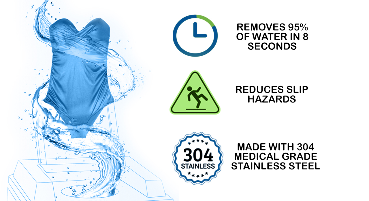 The Suitmate Swimsuit Dryer is great for commercial pools (or any facility with water) who need an efficent extractor that can be used to spin dry a wet bathing suit in 8 seconds. Using centrifugal force, this American made machine removes 95% of a suit’s water and reducese the hazards in commericial pools, while also making your members happy. The automatic timer helps protect your Suitmate water extractor from overuse. Used to keep pool water from facility damage, the Suitmate is the most reliable and durable swimsuit dryer for commercial pools.