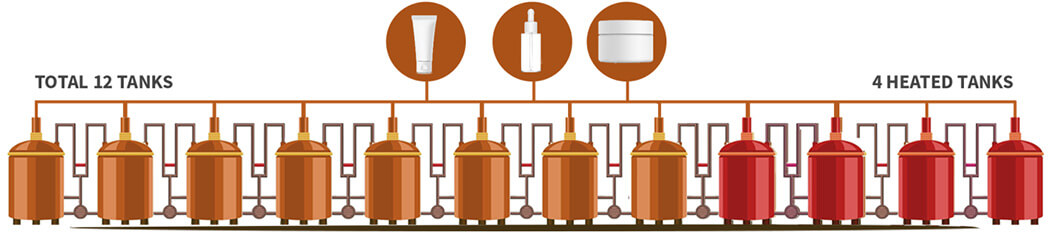 Our two labs and team of chemists/compounders, combined with our production resources, enable us to create everything from hair care products (like hair gels and mousse) to sanitization products (like hand sanitizer and wipes). Our state of the art 60,000 sq.ft. facility includes 12 kettles ranging from 100kg to 20000kg (two of them are jacketed mixing tanks), and a cooling line that allow us to make mostly all required liquids and some solids like pomades.
